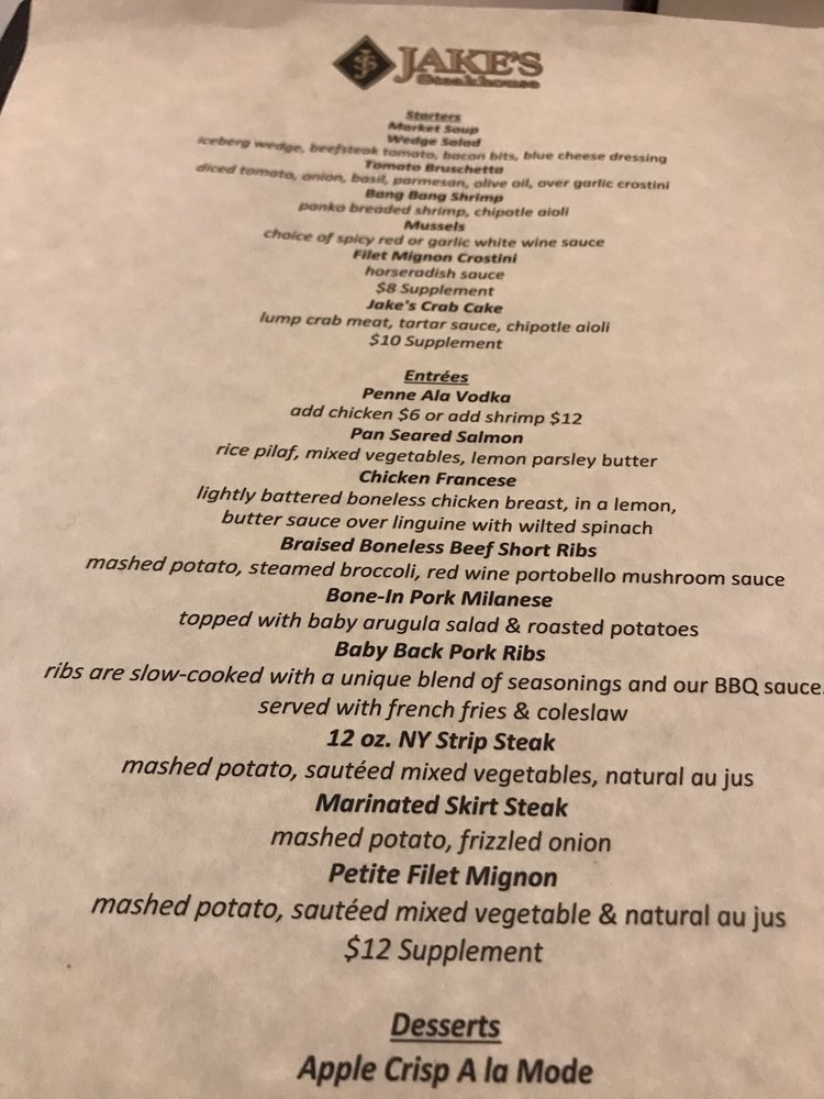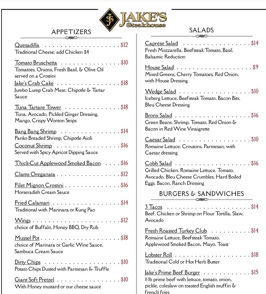 Jake's Steakhouse, located in East Meadow, NY, offers a diverse menu featuring steaks, sandwiches, burgers, and a raw bar. With amenities like outdoor seating, a full bar, and free Wi-Fi, it caters to a range of dining preferences. Their appetizers include mouthwatering options like Clams Oreganata and Jake's Crab Cake, while their soups and salads feature fresh, flavorful choices like Beefsteak Tomato/Avocado/Red Onion Salad and Onion Soup short rib. Customers rave about the attentive service and delicious food, with reviews praising the steaks for melting in your mouth. The ambiance is described as great for special occasions, with a price fixed menu and creative offerings. Whether you're looking for a casual lunch or a classy dinner, Jake's Steakhouse provides a satisfying dining experience.